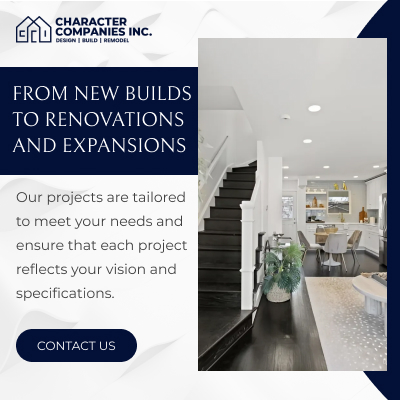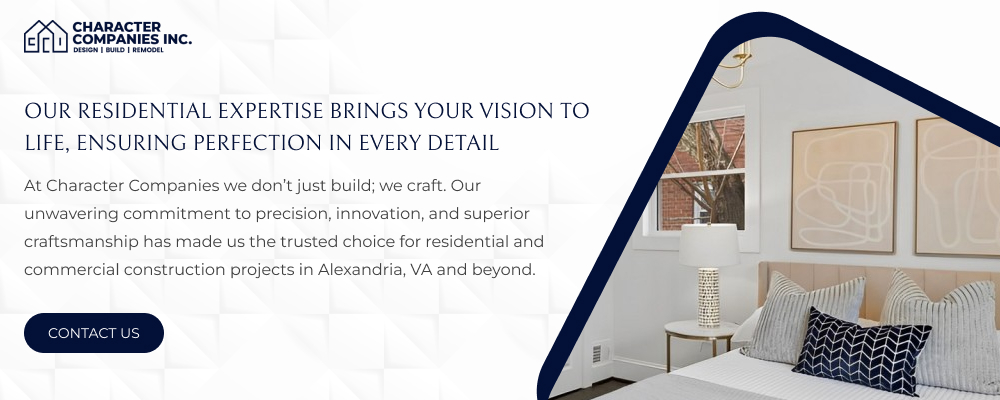 Character Companies is your trusted home remodeling partner in Alexandria, VA and nearby areas. We offer interior remodeling services, specializing in kitchen and bathroom remodeling services as well as whole-house renovations. Our expertise spans design build, home renovation, property revitalization, and residential construction. With a focus on custom home building and architectural design, we guarantee your home improvement projects will exceed expectations. Discover the difference with us today.